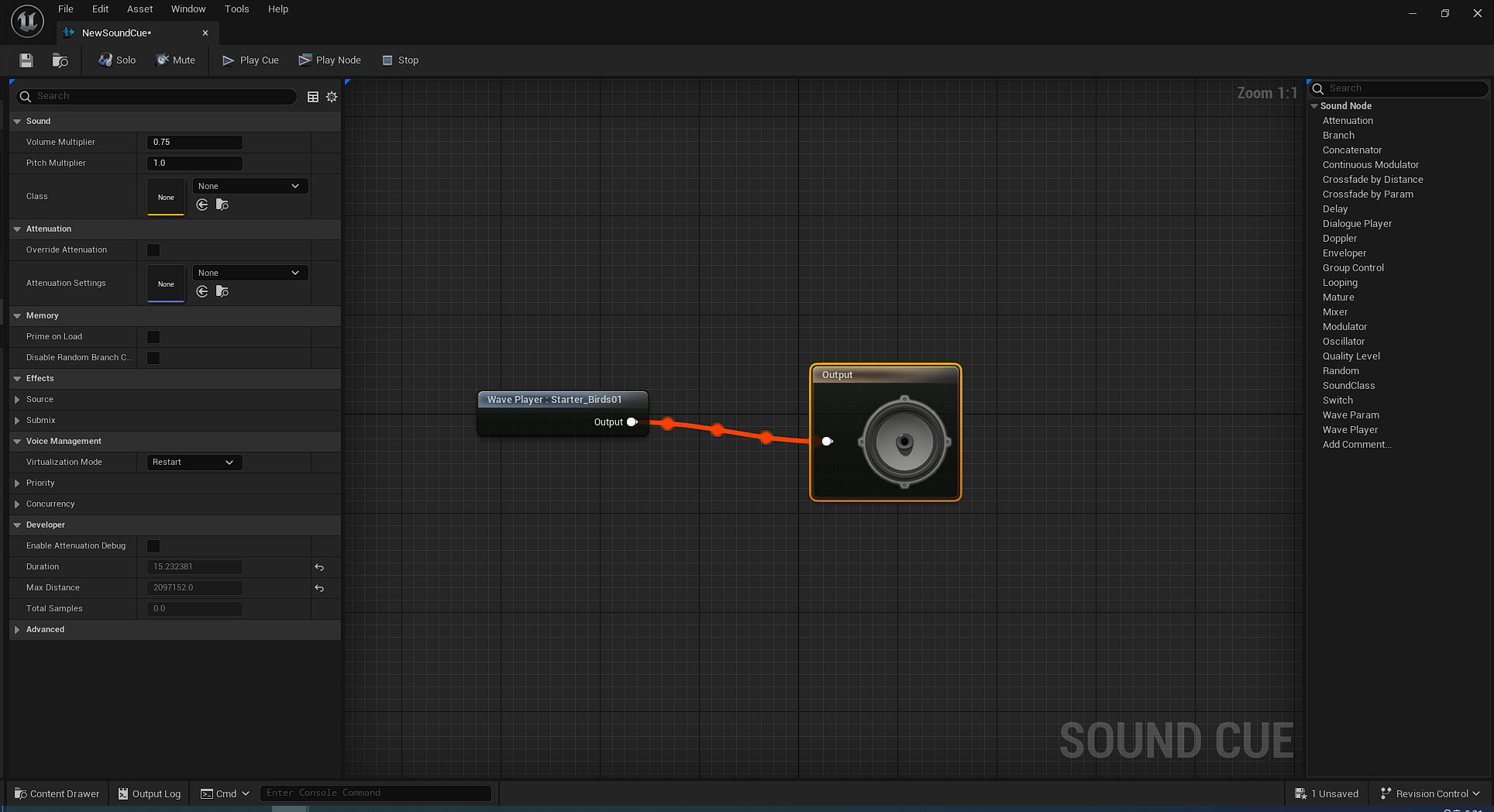 새로운 사운드 큐를 생성하고, 사운드 큐 에디터 내부에 Wave Player 노드를 만들어 Output에 연결해 줌으로써 간단한 사운드 재생 에셋을 만들 수 있다.