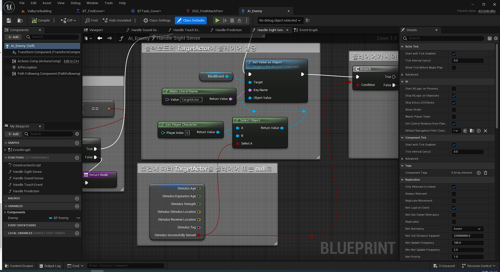 다만 Sight Sense Handling 함수를 수정할 필요가 있다. 원래 플레이어가 시야에서 사라지는 즉시 TargetActor를 지워버렸는데, 엄폐하고있는 동안은 플레이어가 시야에서 사라진다고 해서 TargetActor를 잊어버린다면 바보가 될것이다.