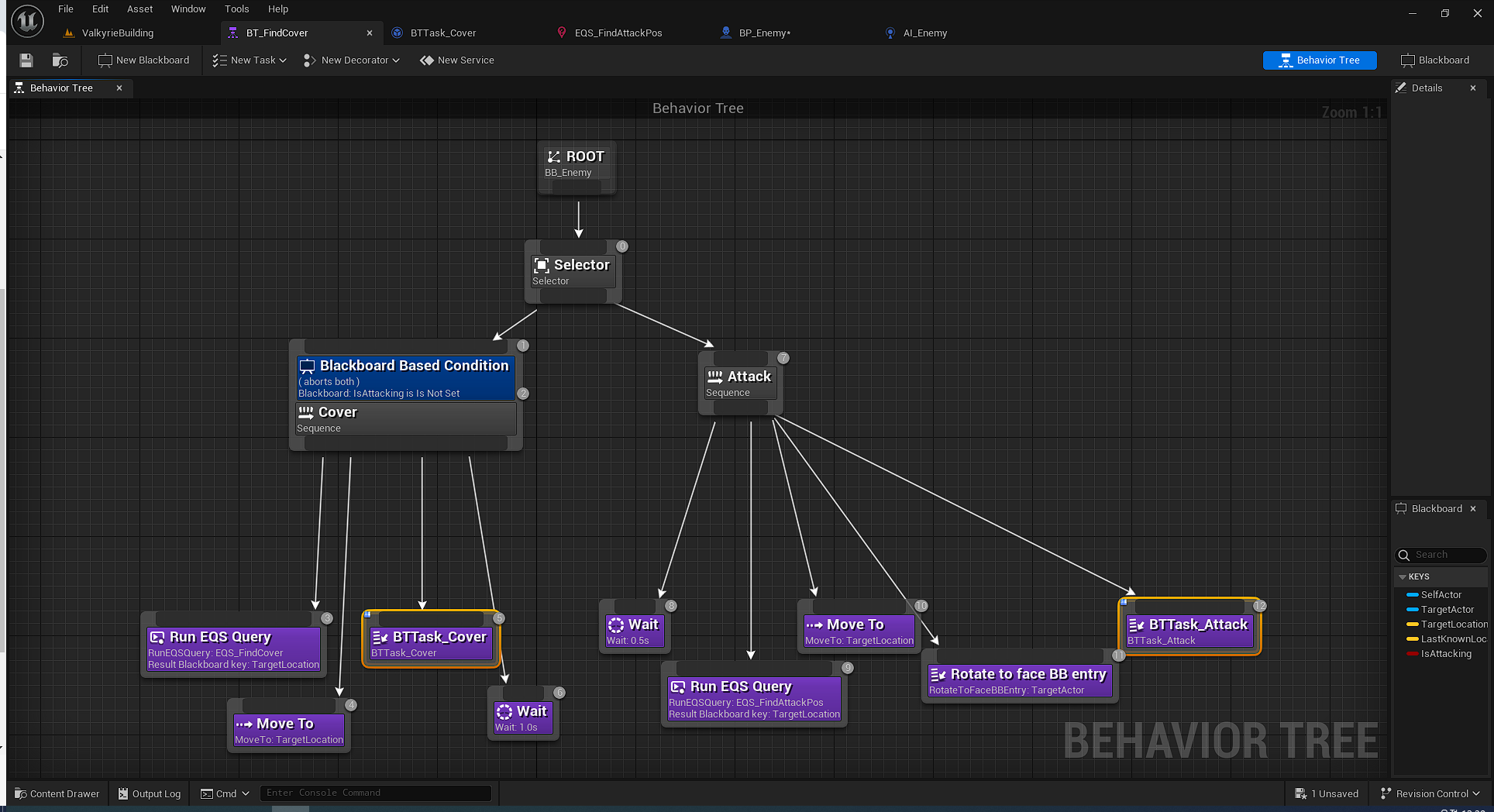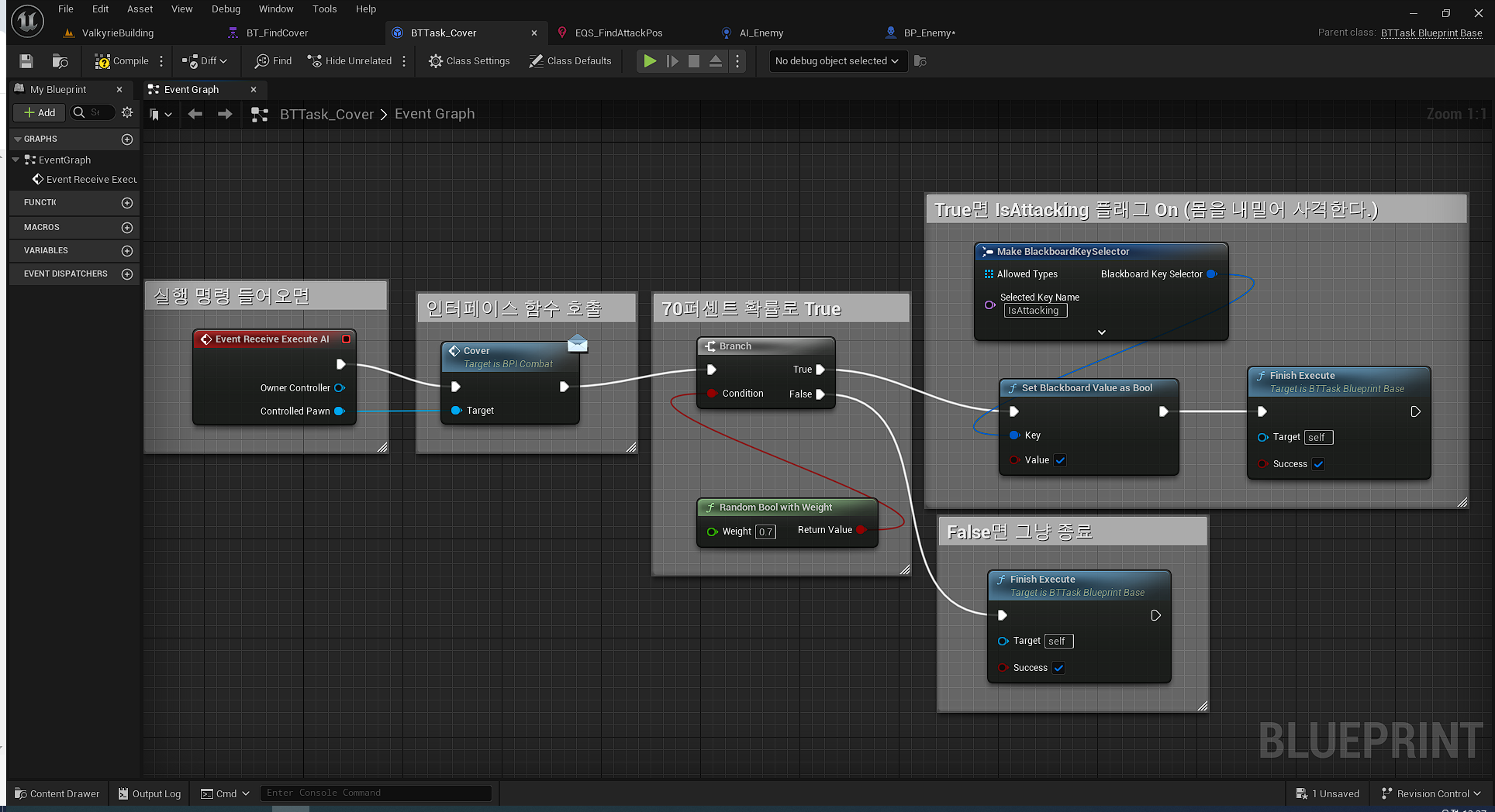 잊지 말아야 할 것이 하나 남았다. BP_Enemy의 AIController인 AI_Enemy가 사용하던 비헤이비어 트리는 BT_Enemy이지 BT_FindCover가 아니다.