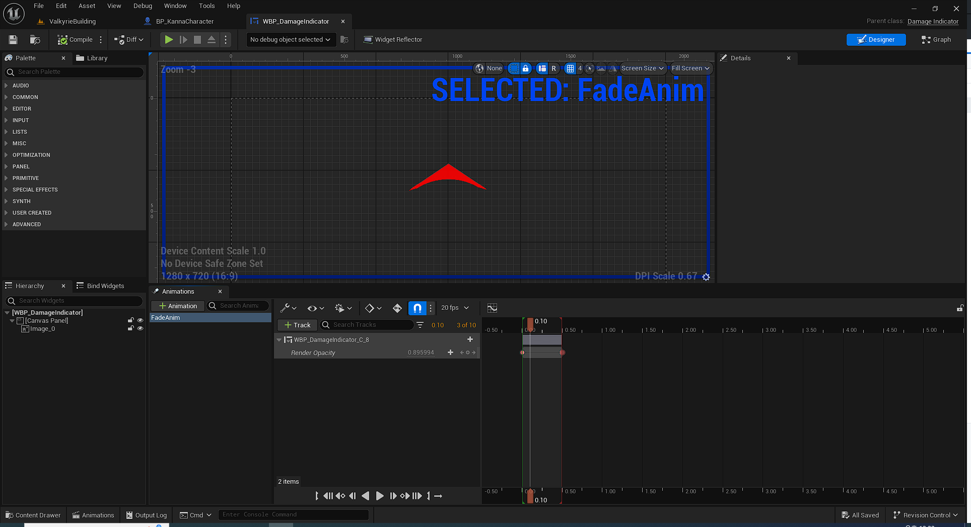 UserWidget을 부모로 하는 블루프린트를 만들어 WBP_DamageIndicator라 짓고, 구글링으로 찾은 적절한 이미지를 가져와 다음과 같이 배치하였다.