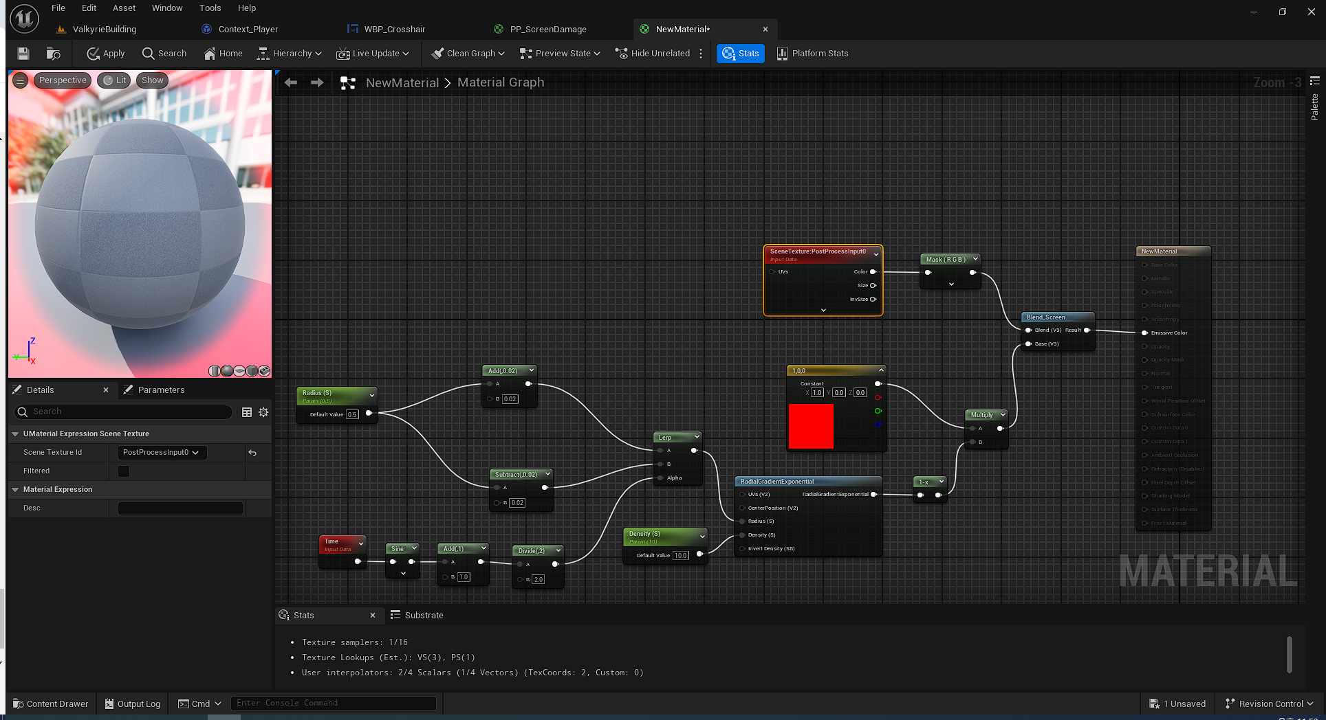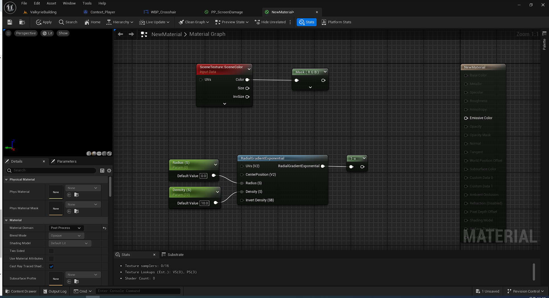우선 머티리얼을 생성하고, 좌측 하단 디테일 패널에서 Material Domain을 PostProcess로 지정해주었다.