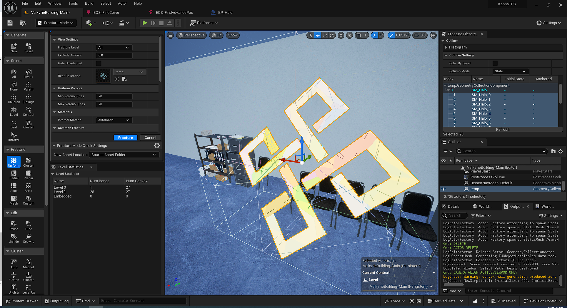 에디터 좌측 상단의 Mode를 Selection에서 Fracture Mode로 바꾸고, 필드에 헤일로 스태틱 메시를 배치한뒤, New를 눌러 새로운 지오메트리 컬렉션을 만들어주었다.