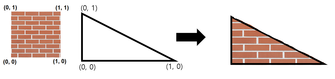 예를들면 삼각형 모양의 모델이 존재하고, 각 버텍스의 텍스쳐 좌표가 (0, 1), (1, 0), (0, 0)이라고 하자.